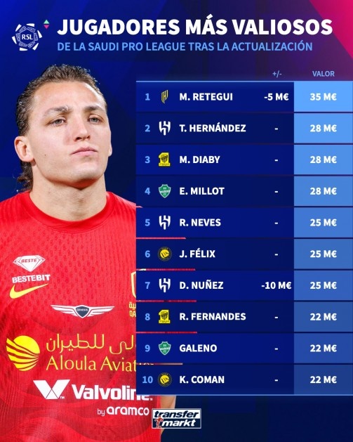 3月30日讯 德国转会市场盘点了沙特联赛球员身价排名,雷特吉3500万欧元排名第一。