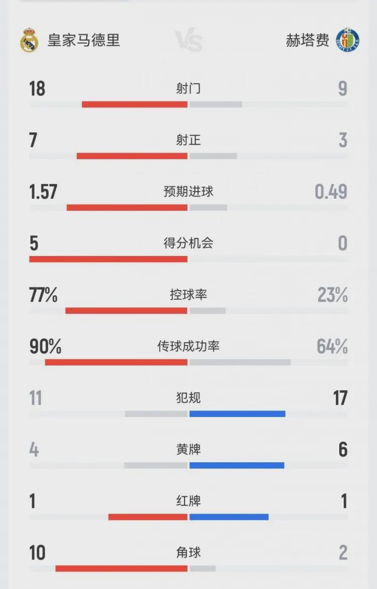 赛后的数据统计荒诞得像个笑话:皇马控球率77%,射门18次,射正7次,预期进球(xG)高达1.57,角球10个;而赫塔费呢?控球率仅23%,射门9次,射正3次。